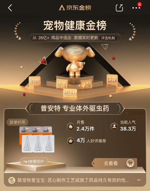 “在京东宠物普安特旗舰店,普安特狗狗猫咪体内外同驱滴剂有20万条评论,好评率96%以上。“据京东宠物普安特旗舰店店长李丽介绍,普安特犬猫专用体内外驱滴剂以月售2.4万件的销量成绩拿下了京东宠物健康金榜的Top1。它采用全透皮和防析出两大技术,药效起效快、见效好,省剂量又省事,能够有效解决宠物叮咬瘙痒、室内外感染、皮肤毛发问题。不少用户使用后评论称“对症下药效果精准,有了普安特驱虫,很多时候都不用上医院了”。
