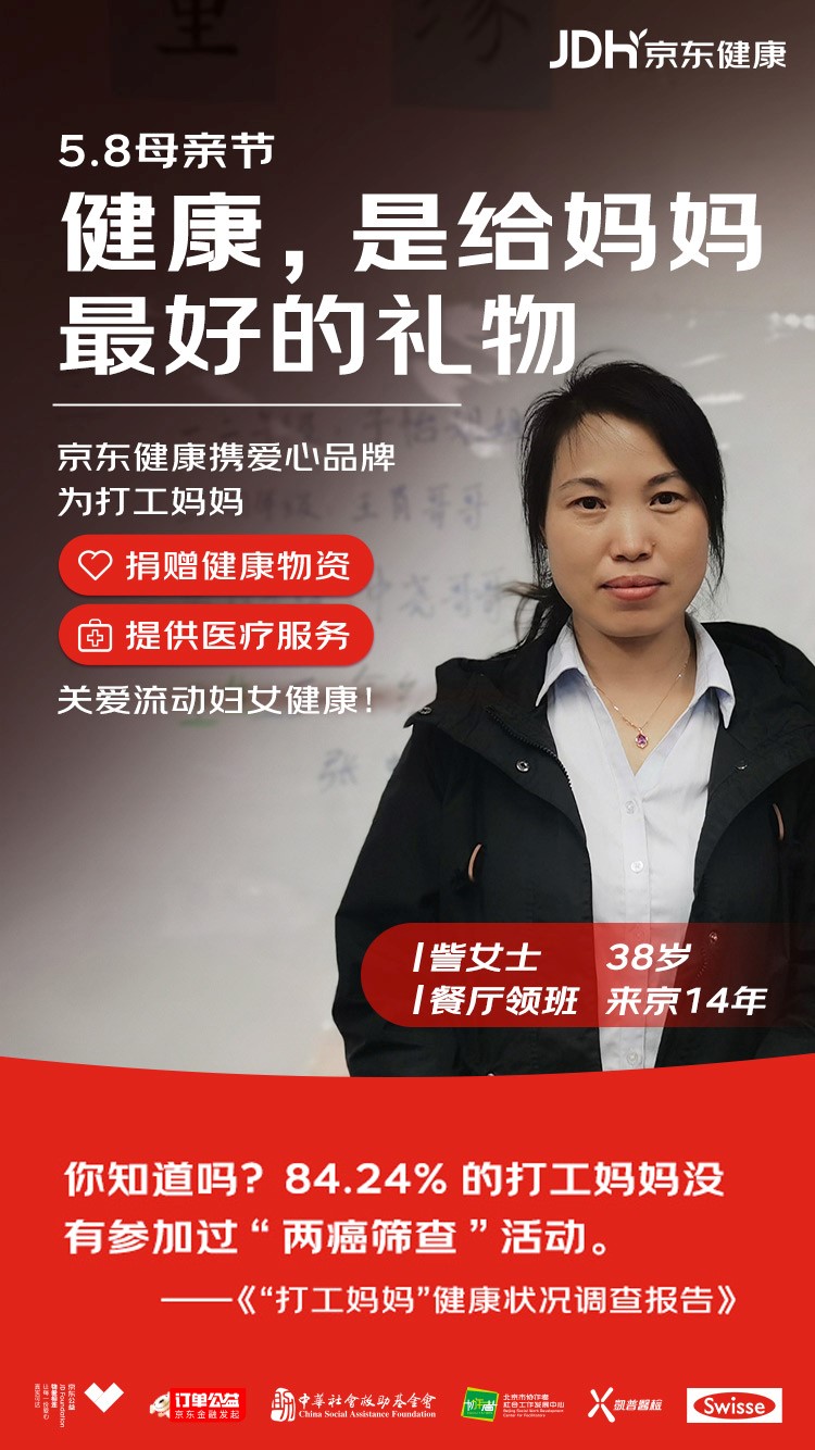 在母亲节即将来临之际,京东健康、中华社会救助基金会、北京市协作者社会工作发展中心,共同启动了以关爱 “打工妈妈”群体健康为主旨的公益行动。京东健康号召爱心品牌、商家以捐物、捐资等多种方式参与此次公益活动,为“打工妈妈”群体提供医疗健康援助。由京东金融与京东公益“物爱相连”平台联合开展的京东“订单公益”项目,也在京东健康的协同下,共同参与了此活动。