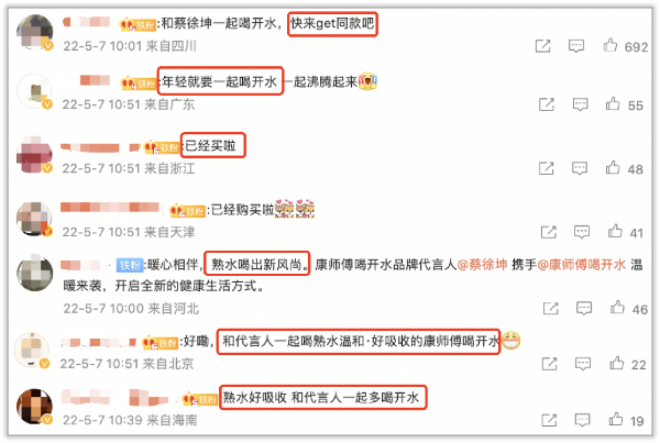 此次伴随TVC上线,顶流加持,高频次OTV投放,抖音信息流加推等,让康师傅喝开水再一次获得高曝光,截至目前,品牌片播放量已高达2729w,不少网友积极晒单和评论“和代言人一起沸腾新势力”、“一起多喝开水”、 “熟水温和・好吸收,就要喝开水”……无疑,这一波沸腾操作有效助推了康师傅喝开水从流量到留量再到销量的成功转化。