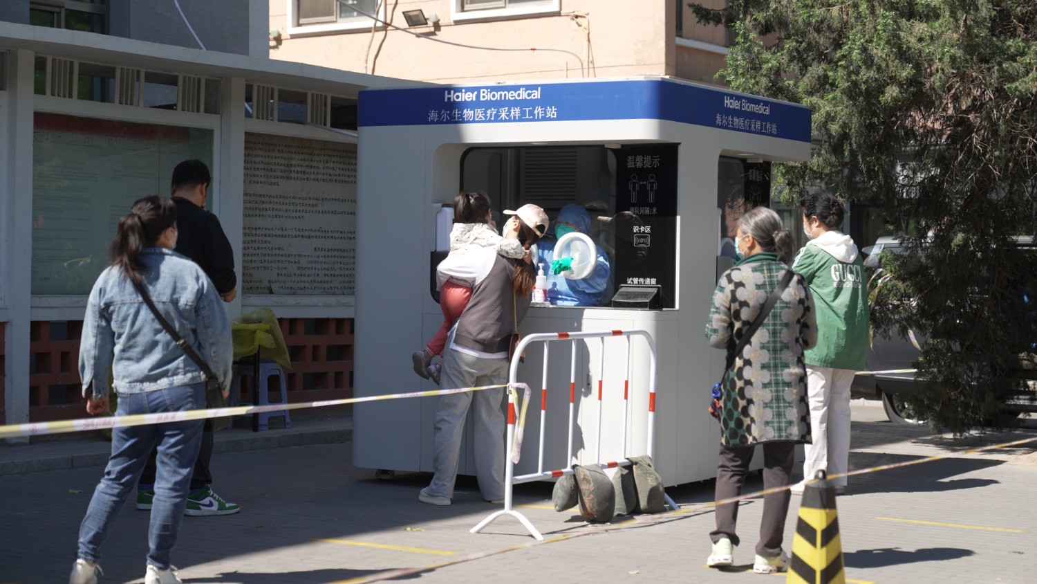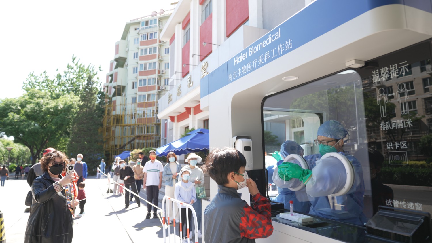 西城区月坛街道居民在海尔生物安全采样工作站前排队核酸采样