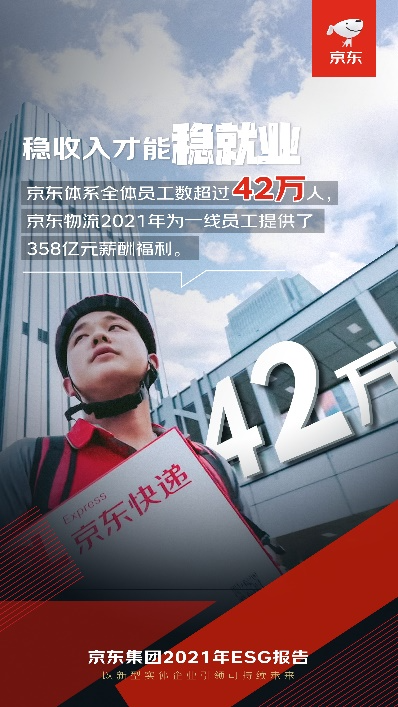 2021年,京东集团全力推动高质量就业,截至2021年底,京东体系上市公司及非上市公司员工数超过42 万人,一线员工中农村地区人口占比达到80%。在绿色发展方面,建成了行业首座“零碳”物流园区,并将新能源物流车的投放量增加到2万辆;从促进中小企业和乡村振兴方面,京东集团已服务省级“专精特新”中小企业超2.7万家,京东乡村振兴“奔富计划”已带动农村实现产值3200亿;在上海抗疫保供中,截至5月初已累计从全国多地紧急调拨了约8万多吨物资,北京京东公益基金会2021 年对外捐赠逾1.2亿元;京东集团始终坚守正道商业价值观,以“合规即发展”推动合规管理。