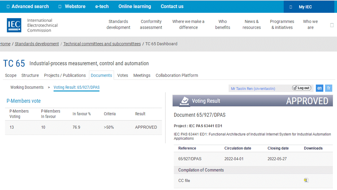 北京时间5月28日凌晨,IEC官网公布,由卡奥斯COSMOPlat联合机械工业仪器仪表综合技术经济研究所(以下简称仪综所)牵头制定的全球首个工业互联网系统功能架构国际标准IEC PAS 63441《Functional Architecture of Industrial Internet System for Industral Automation Applications》通过IEC/TC65(工业测控和自动化)投票,预计在2022年年底正式发布。