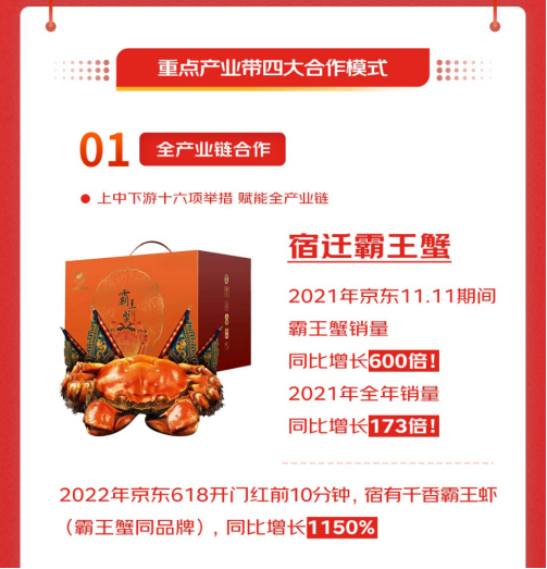 在政企合力下,“霸王蟹”已成为继“项王故里”“中国酒都”“水韵名城”之后的宿迁市“第四张名片”。 2021年京东11.11期间,霸王蟹销量同比增长600倍,2021年全年销量同比增长173倍;2022年京东618开门红前10分钟,宿有千香霸王虾(霸王蟹同品牌),同比增长1150%。