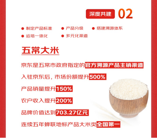 自2019年10月五常大米入驻京东以来,五常大米品牌价值得到较高提升,销量也得到显著提高。2021年,五常大米品牌价值达到703.27亿元,连续五年蝉联地标产品大米类全国第一。五常大米市场份额占比提升500%,产品销量提升150%,超过4000户农受益,京东也成为五常市政府合作及五常大米官方溯源产品销售量最大的电商渠道,成功实现多方受益,进一步助力五常市实现乡村振兴,产业兴旺。