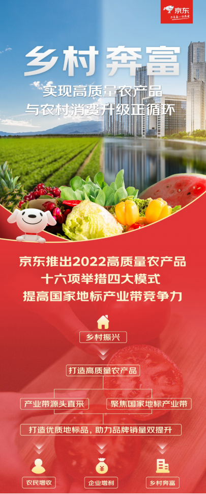 为助力乡村振兴,打造高质量农产品,京东充分发挥电商全产业链优势,协同政府、企业、农民共同打造高品质农产品,与各地政府签约共谋产业发展、与产业链龙头企业供应链合作,帮扶重点品牌做大做强,着力推动并深化与国家地标产业带的合作,成就奔富村、奔富人,助力优质地标产品实现品牌塑造,取得销量和品牌声量的双丰收,推动农业农产品高质量发展。