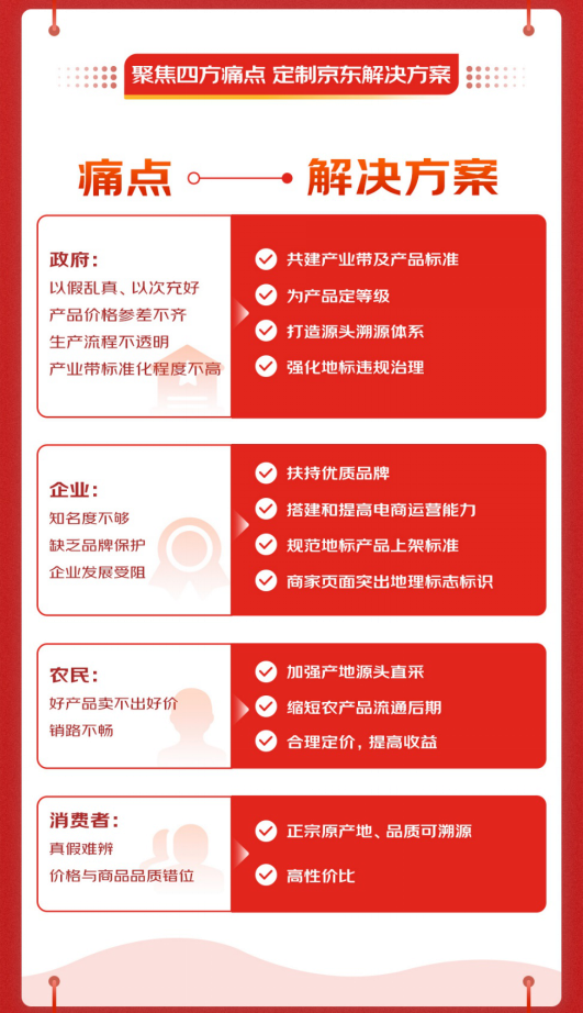 为解决地方政府及相关机构关于产业带的诸多痛点,京东协助政府治理行业乱象、深度共建产业带及产品标准、积极联合对接地标产业带政府强化地标违规治理、确保平台地标资质100%合规、为产品定等级,搭建溯源体系奠定基础,确保后续消费者买到正宗原产地、品质可溯源、物有所值的高质量农产品。