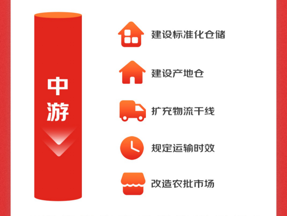在产业链中游,京东推出五大举措:建设标准化仓储、建设产地仓、扩充物流干线、建立时效性运输标准、改造农批市场进行产业带投入和优化升级。