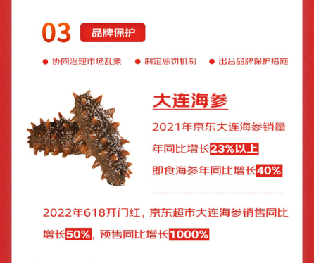 为保护地标产业带,京东还将深度参与到品牌治理、保护中。大连海参作为全国第一个海参国家地理标志保护产品,历史悠久、品质优良,但海参市场却存在市场紊乱,消费者不知如何选购优质海参等诸多问题,对此,京东运用品牌保护模式,联合当地政府与海参企业联合发布了京东大连海参产品标准,为海参分等级销售,并推动大连海参产业在电商化、数字化、品牌化方面高质量发展,对大连海参这一地标农产品形成有力保护。2021年京东大连海参销量年同比增长23%以上,即食海参年同比增长40%,2022年618开门红,京东超市大连海参销售同比增长50%,预售同比增长1000%。