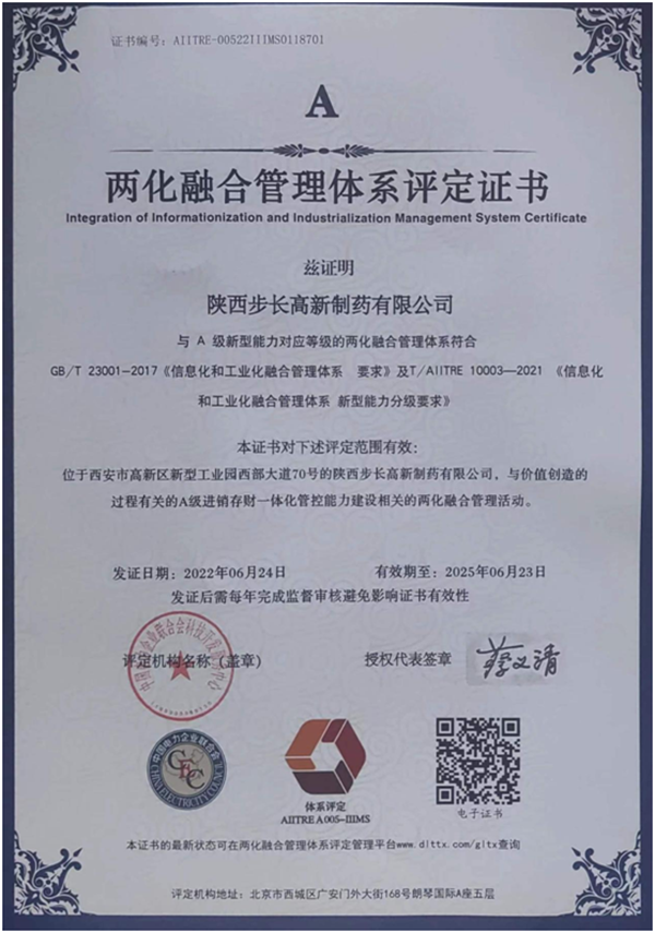 步长高新为积极响应国家全面推广信息化和工业化融合管理体系标准的政策,提升管理效率带动企业技术,产品与管理创新,提高企业核心竞争优势,通过对公司过程管理来持续打造企业信息化环境下新型能力,同时更好将信息化融入企业管理中,于2021年05月顺利召开了两化融合管理体系贯标启动会,成立了两化融合推行领导小组和工作小组。通过深入学习领会,按照GB/T23001-2017《信息化和工业化融合管理体系要求》及T/AIITRE 10003-2021《信息化和工业化融合管理体系新型能力分级要求》最终完成两化融合管理体系的文件编制与修订、运行、内部审核、管理评审等工作。经逐级申报由西安市工业和信息化局最终审核通过,于2021年09月成功入选为西安市级两化融合管理体系贯标试点企业。2022年04月通过了专家审核组的现场审核,经国家两化融合评定委员会评定,顺利通过以打造“与价值创造的过程有关的A级进销存财一体化管控能力建设”为两化融合管理活动目标的认证工作。