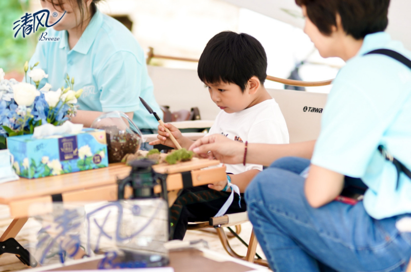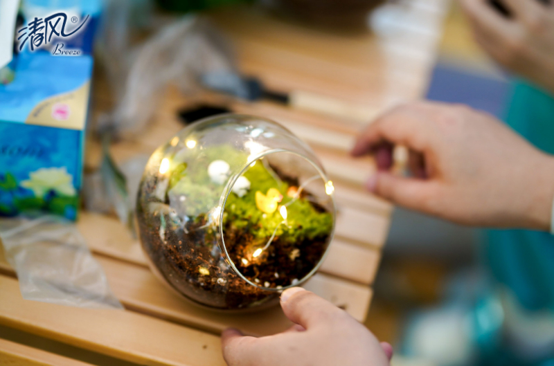 近日,清风发起绿色清风探索之旅活动,邀请消费者走进清风林场,体验绿色低碳生活。图为嘉宾参与DIY微森林互动。pagebreak