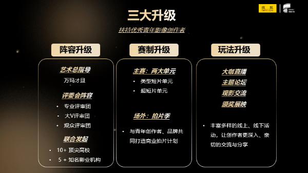 青幕计划作为一股影像创作领域的新生力量,首次举办便收到了600多部短片,展现出年轻人对于短片创作、新类型、新表达的探索与开创。第二届青幕计划继续乘风而行,将从三大维度全新升级:阵容升级、赛制升级、玩法升级,进一步提升大赛水平,扶持青年影像创作者。