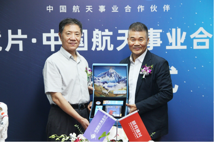 中国航天基金会理事长吴志坚、明月镜片董事长谢公晚互赠礼物