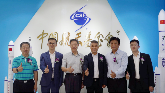 嘉宾从左至右:中国航天基金会副秘书长袁茂富、中国航天基金会理事长吴志坚、中国航天基金会事业发展部部长杨爱民、明月镜片常务副总裁曾哲、明月镜片董事长谢公晚、明月镜片品牌与市场中心总监廖鹏