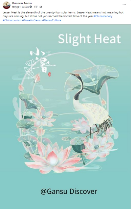 账号结合甘肃特色元素,将中国二十四节气和中国重要传统节日作为主题契机,共制作并推出超过20张海报,配以英文本土化帖文向海外用户介绍中国传统文化。