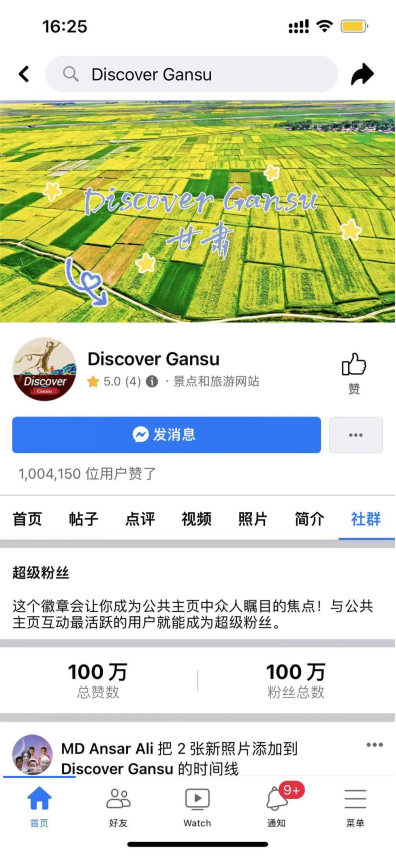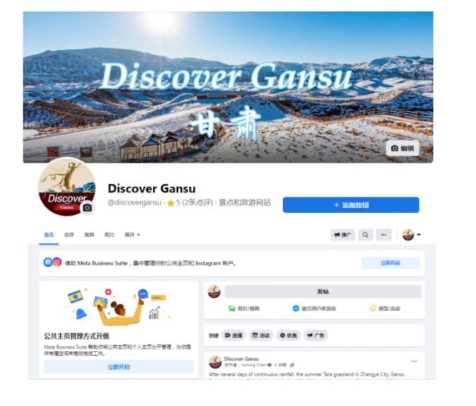 甘肃文旅海外宣传传来好消息:由新华社负责运维的甘肃文旅Facebook(脸谱)官方账号Discover Gansu(探索甘肃)粉丝量突破百万大关,成为具有广泛影响力的“大V”级文旅品牌账号,成为向世界宣传推介甘肃文化旅游的重要阵地。