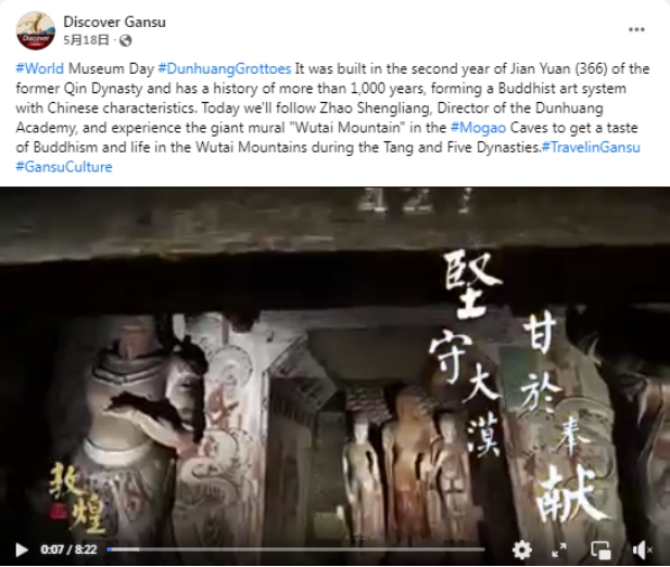 Discover Gansu账号开设以来,持续制作发布甘肃优质原创内容,涵盖自然风光、地域风情、传统文化、旅游资讯等多个方面,可以说全方位覆盖了甘肃文化旅游产业。甘肃敦煌莫高窟举世闻名,账号在国际博物馆日当天发布了敦煌研究院的《一事一生 一人一窟》《敦煌壁画可以有多美》视频。视频配以英文文案介绍甘肃莫高窟和敦煌研究院的前世今生、文化历史,以及旅游资讯等方面,为世界文化传承和保护所做出的发展贡献。