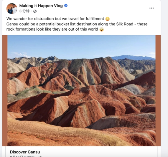 为了向世界讲好甘肃故事,传播好甘肃声音,2020年8月初,甘肃文旅正式入驻Facebook平台开设官方账号DiscoverGansu。两年来,账号以“发现美丽甘肃之窗”为外宣定位,依靠高质量内容持续输出,实现快速破圈,8月26日粉丝量已突破100万大关,成为甘肃众多海外社交账号中的佼佼者。