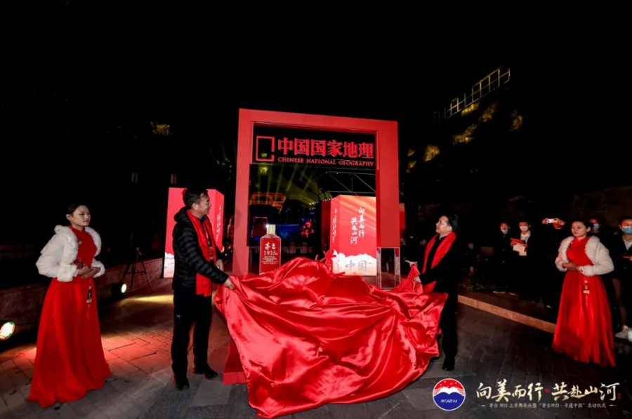 《中国国家地理》杂志社、社长兼总编辑李栓科与茅台集团董事长丁雄军共同揭幕“茅台1935·寻道中国”科学探索的第一个中国国家地理红框