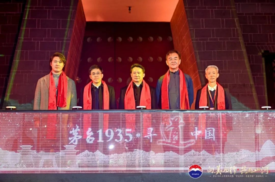 《中国国家地理》杂志社、社长兼总编辑李栓科李栓科(右二)、茅台集团董事长丁雄军(中)、茅台集团党委副书记、总经理李静仁(左二)、中国电影集团合作导演曹子霄(左一)、经销商代表李秋水(右一)启动“茅台1935·寻道中国”科考活动