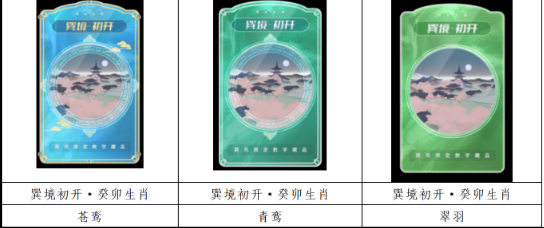 自巽风数字世界1月1日上线以来,已先后发布玉兔·瑞盈、巽境系列、玉兔·瑞盈(新春版)、瑞兔踏春新年时装四类数字藏品。1月29日至1月31日,获取过以上数字藏品的用户可合成不同系列的典藏版“巽境初开·癸卯生肖”数字藏品,以兹对巽风数字世界上线和癸卯新春的纪念。用4个不重复的数字藏品可合成巽境初开·癸卯生肖(苍鸾)数字藏品;用任意3个不重复的数字藏品可合成巽境初开·癸卯生肖(青鸾)数字藏品,用任意2个不重复的数字藏品可合成巽境初开·癸卯生肖(翠羽)数字藏品。