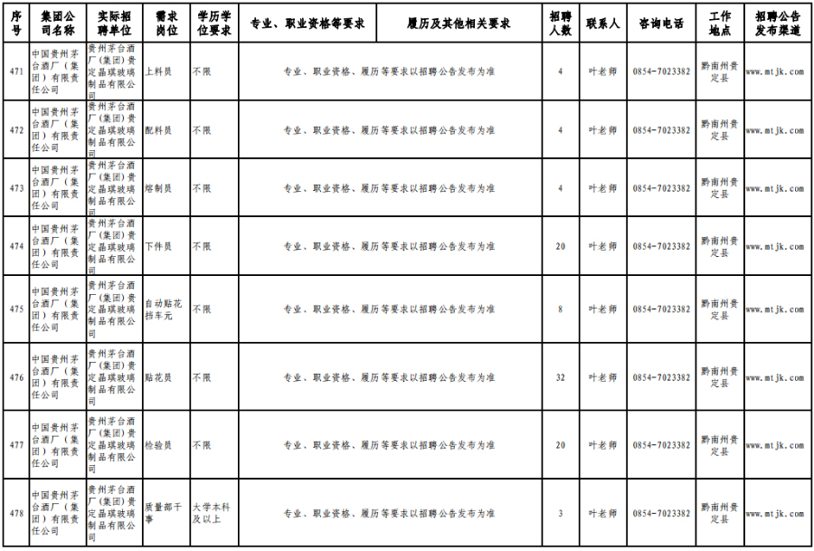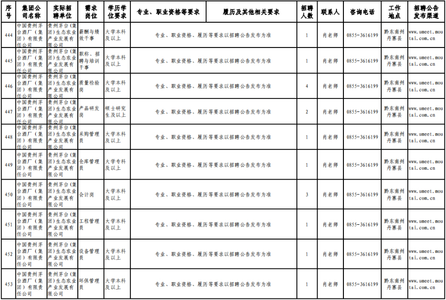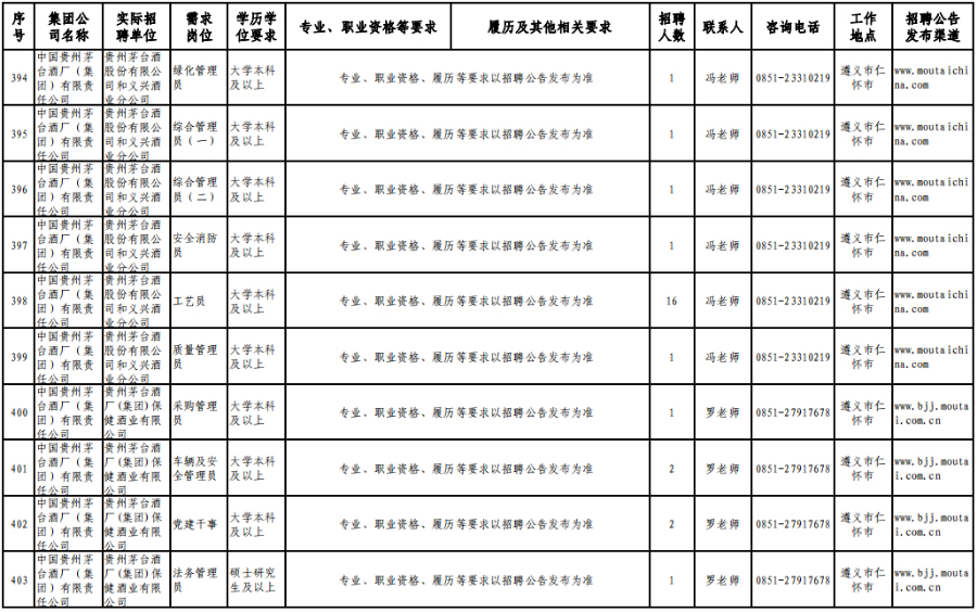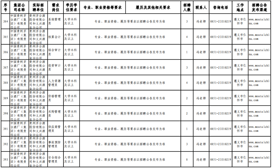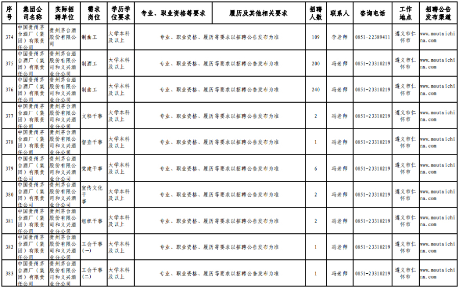 3月15日,在贵州理工学院(贵安校区)体育运动场举办的专场招聘会上,茅台集团计划招聘1120人。旗下贵州茅台酒股份有限公司招聘制曲工109人,贵州茅台酒股份有限公司和义兴分公司招聘制酒工200人、制曲工240人,其余在本场招聘会开展招聘的还有贵州茅台酒厂(集团)保健酒业有限公司、贵州省仁怀市仁帅酒业有限公司、贵州茅台酒厂(集团)物流有限责任公司、贵州茅台(集团)生态农业产业发展有限公司等,岗位包含宣传文化干事、采购管理员、工艺质量管理员、信息化会计等。