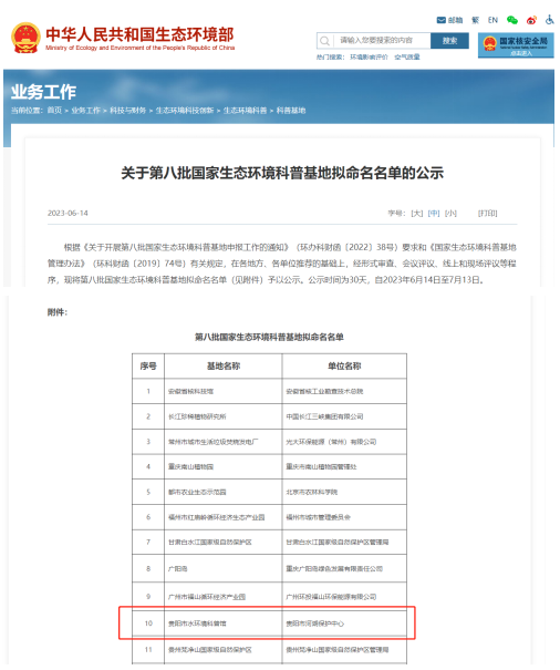 在第一个全国生态日(8月15日)即将到来之际,生态环境部与科技部公布了第八批国家生态环境科普基地拟命名名单。其中,中国水环境集团上海嘉定南翔下沉式再生水厂及贵阳青山下沉式再生水厂项目地面水环境科普馆入选.
