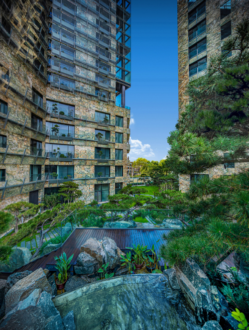 正如让·努维尔所言:“建筑应能够使人沉浸的同时,自身沉浸于环境。”因此让·努维尔为了真正与中轴线历史文脉融合,遵循“生长的建筑”的设计理念,通过垂直森林瀑布,自然原石立面、窗含鸟巢视野、极简美学空间等细节的表达,消解千篇一律的“钢铁森林”,同时也体现出万科对于城市人居的全新探索。