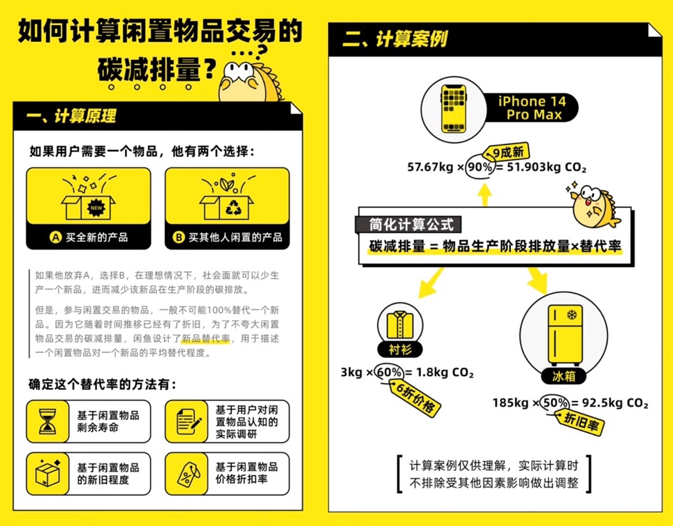 “不同于以往减碳方法学的研究,此次发布的团体标准基于对闲鱼为主的闲置交易平台的深入研究,更精细化地对闲置物品交易的碳减排量进行了科学考量。”北京绿色交易所碳交易中心高级经理王宇飞介绍,其中《闲置交易减排量评估通用要求》基于闲置物品的剩余寿命、新旧程度、价格折扣率等因素,设计提出了“新品替代率”的概念,可以让闲置交易的减碳量更加真实和准确。