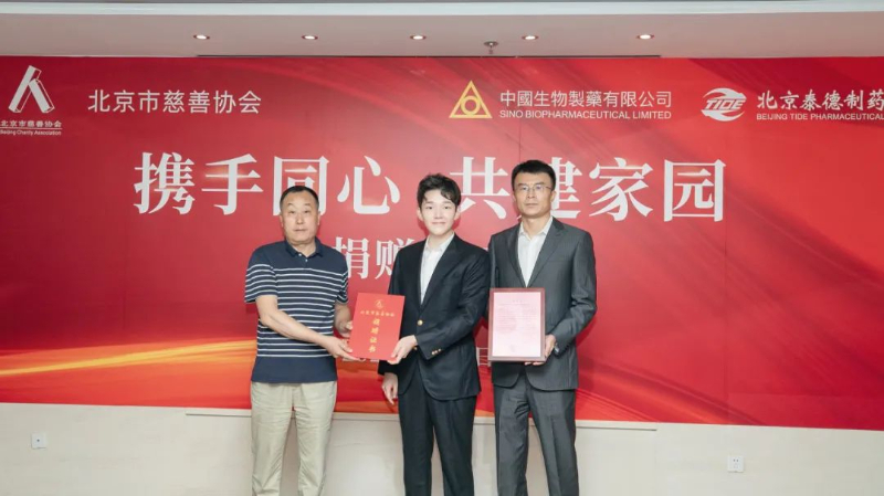 2023年9月5日,在第8个“中华慈善日”来临之际,“携手同心 共建家园”捐赠仪式在北京市慈善协会举行。中国生物制药有限公司与旗下北京泰德制药股份有限公司、正大天晴药业集团一道,向北京市慈善协会捐赠200万元,用于支持北京市洪灾地区灾后重建,助力灾区群众重建美好家园。捐赠仪式在北京市慈善协会举行,北京市委统战部副部长、市台联党组书记黄克瀛,北京市委社会工委委员、市民政局副局长卢建出席。