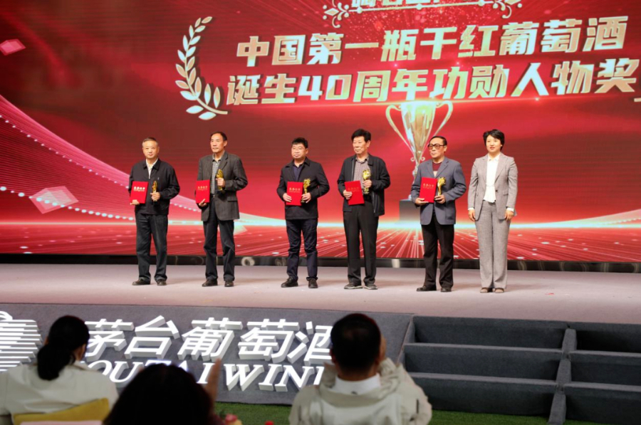 在四十年产区贡献颁奖仪式上,与会领导嘉宾为碣石山产区葡萄酒产业发展做出突出贡献的相关企业和人员进行颁奖。