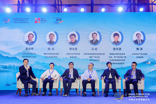 新华网博鳌12月3日电(伊媛) 12月2日-5日,2023中国企业家博鳌论坛在海南博鳌举办。在3日举行的平行分论坛——2023中国文化经济发展论坛上,在第三场圆桌对话环节,来自文化领域的专家学者围绕“数字经济时代文化产业发展的机遇与挑战”的主题,各抒己见,展开了一场精彩的讨论。本场对话由上海交通大学产业经济研究中心主任史占中主持。