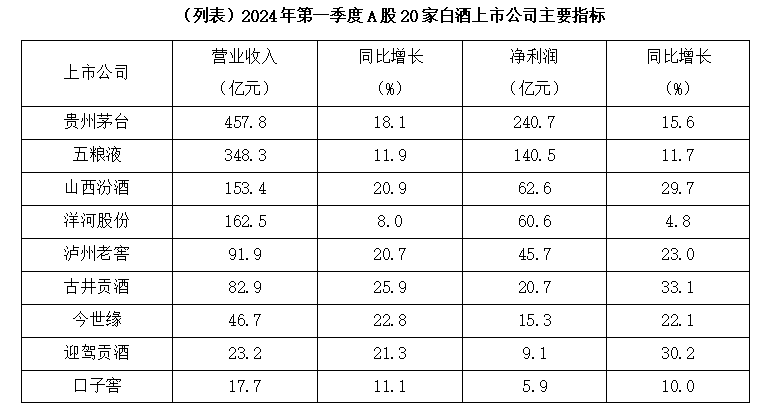 从A股20家白酒上市企业业绩来看,一季度合计实现营业收入1501.6亿元,同比增长15%;实现净利润619.9亿元,同比增长16%。从一季报中反映出,上市白酒企业业绩正加速分化,大部分名酒企业营收和利润均保持了两位数增长,营收同比增长的15家,下滑的从上年的2家增至5家,显示出次高端和大众酒市场竞争比较激烈。