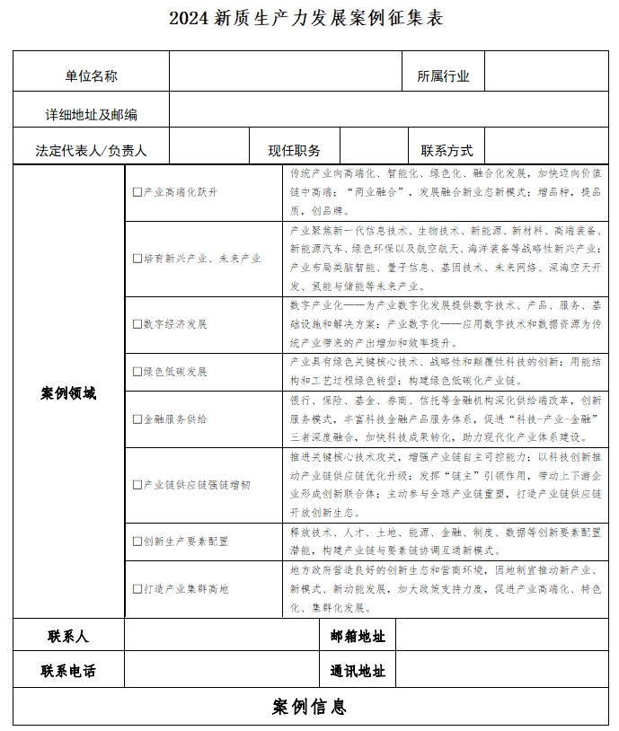 4、《2024新质生产力发展案例征集表》须按照表格进行填写,案例情况叙述准确、逻辑性强、充分展现“创新”、“质优”、“先进生产力”的特点(单篇案例字数1500-2000字,文字、图片结合);