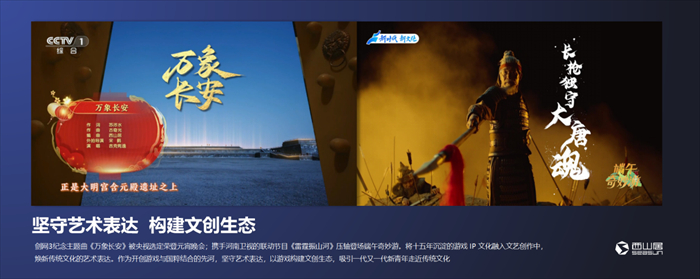 2024年央视元宵晚会上,一曲署名西山居词作的《万象长安》引爆微博热搜,以独有的旋律与诸君共赴盛唐之旅,一同领略大唐盛世的恢宏景象。今年西山居还携手河南卫视在2024年端午奇妙夜中联动节目《雷霆振山河》,将十五年沉淀的游戏IP文化融入舞蹈艺术,将游戏的侠肝义胆与家国情怀相融合,把属于中华民族的文化瑰宝与精神弘扬和传承下去。