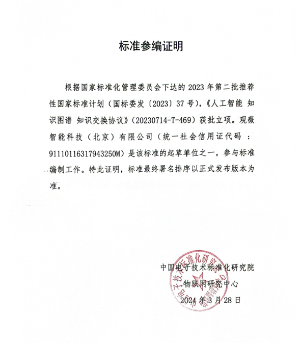 在中国电子技术标准化研究院依托全国信标委人工智能分委会知识图谱工作组主办的《人工智能 知识图谱 知识交换协议》国家标准编制过程中,作为AI+大健康的代表企业,观薇智能积极为此项国家标准编制建言献策,以实际行动助力行业发展。
