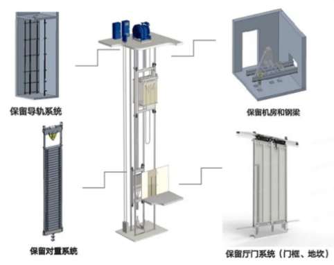 保留部件包含导轨系统、对重系统、机房钢梁和厅门系统