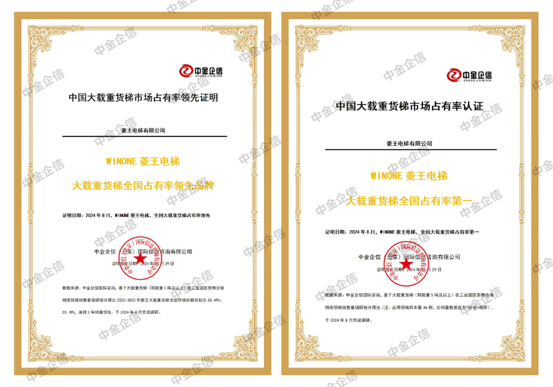 在电梯行业的新发展时期,菱王电梯有限公司获得了中金企信国际咨询发布的两项重量级认证——“WINONE菱王电梯载货电梯全国销量第一”与“WINONE菱王电梯大载重货梯全国占有率第一”。这些认证不仅标志着菱王载货电梯在电梯行业细分领域的卓越销量,也凸显了其在大载重货梯市场的主导地位。