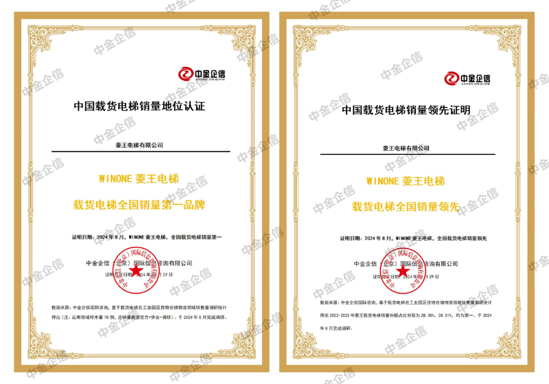 “WINONE菱王电梯载货电梯全国销量第一”与“WINONE菱王电梯大载重货梯全国占有率第一”两项认证,不仅是市场对菱王电梯产品质量和服务的深度认可,也是对其行业领先地位的肯定。