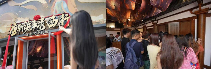无独有偶,热播大剧《唐朝诡事录·西行》的线下沉浸剧场,也于近期落户深圳欢乐港湾。项目以热门IP融合数字科技,打造“唐风实景+真人演绎”沉浸式体验。踏入剧场,观众即穿越到繁华的唐朝,商贩的叫卖声、行人的谈笑声、马车的辘辘声交织在一起,观众佩戴配饰、乘坐载具、破解迷案,可开启一场穿越千年的盛唐文化之旅。