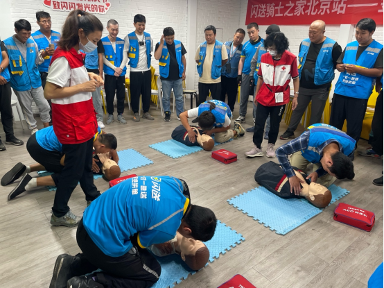 此外,闪送还不定期面向骑手开展交通安全培训和急救知识培训。这是由于近年来,随着闪送员等灵活就业群体的不断扩大,骑手作为维持城市正常运转的“摆渡人”,参与到意外事故救援的事件屡见不鲜。在灵活就业群体中普及专业急救知识显得尤为重要,因此,自2021年起,闪送开始组织闪送员参加急救培训,并成立了闪送红十字爱心志愿服务队。