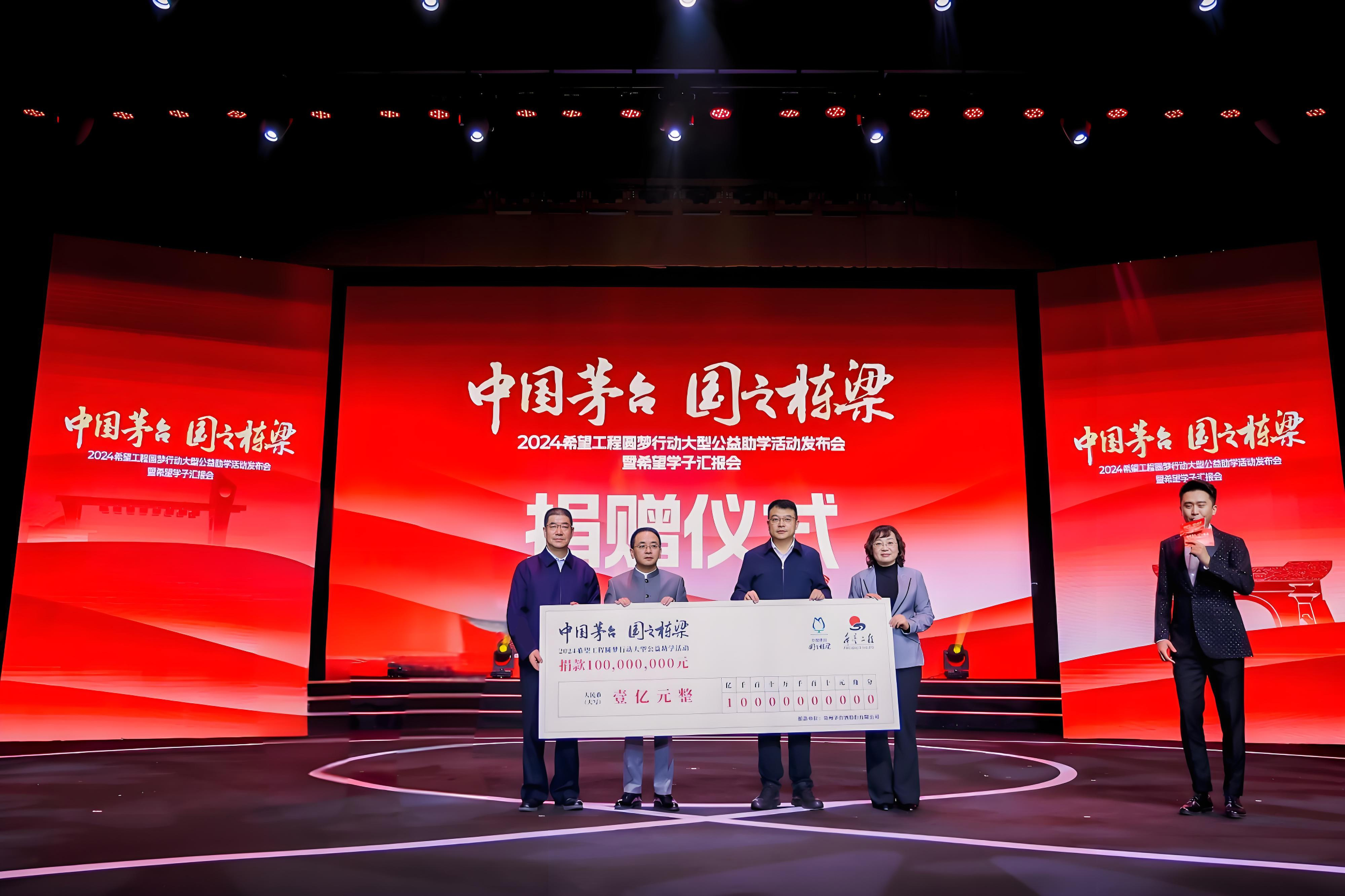 在当天的活动捐赠仪式上,茅台集团党委书记、董事长张德芹,贵州茅台公益基金会理事长卓玛才让代表贵州茅台向中国青少年发展基金会递交 1 亿元捐赠牌;中国青基会党委书记梅峰、共青团贵州省委书记杨云代表中国青基会、共青团贵州省委接受捐赠牌,标志着贵州茅台捐资 1 亿元,持续助力学子圆梦。
