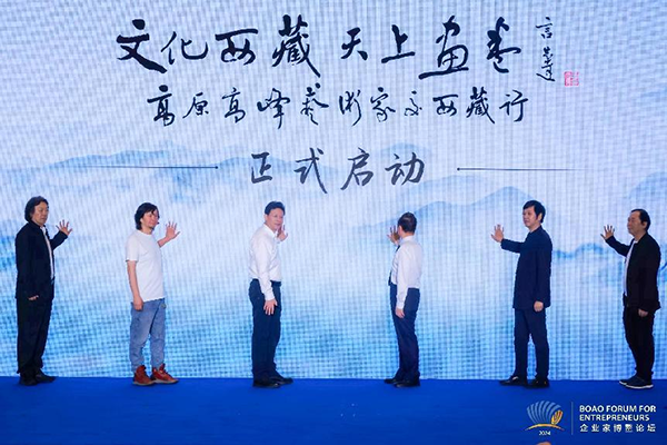接下来,进入了本次论坛最重要的环节——“文化西藏天上画卷·高原高峰艺术家西藏行项目”启动仪式。新华网股份有限公司党委书记、董事长储学军,西藏自治区文化和旅游厅党组成员、副厅长石玉辉,西藏自治区美术家协会名誉主席唐天源,中国文艺志愿者协会副主席、中国美术家协会理事、中国国家画院美术馆原馆长何加林,中国美术家协会理事、中国文联美术艺术中心原主任丁杰,中国美术家协会中国画艺委会委员、福建省美术家协会副主席兼山水画艺委会主任梁明作为代表,共同上台一起启动了“文化西藏天上画卷·高原高峰艺术家西藏行项目”。