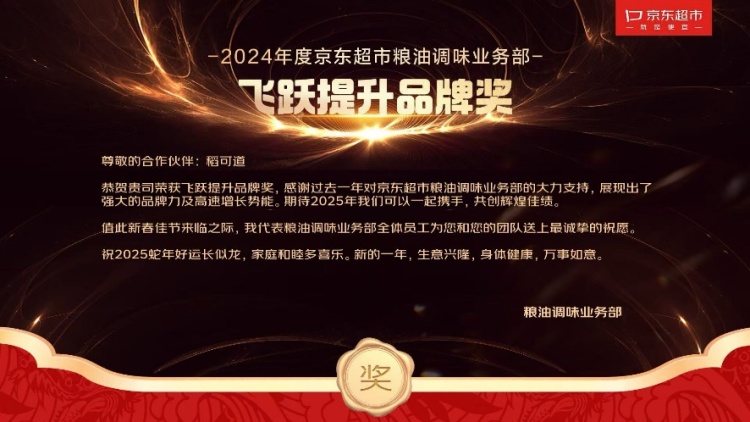 近日,东方集团旗下品牌米“稻可道”获2024年度京东超市粮油调味飞跃提升品牌奖。