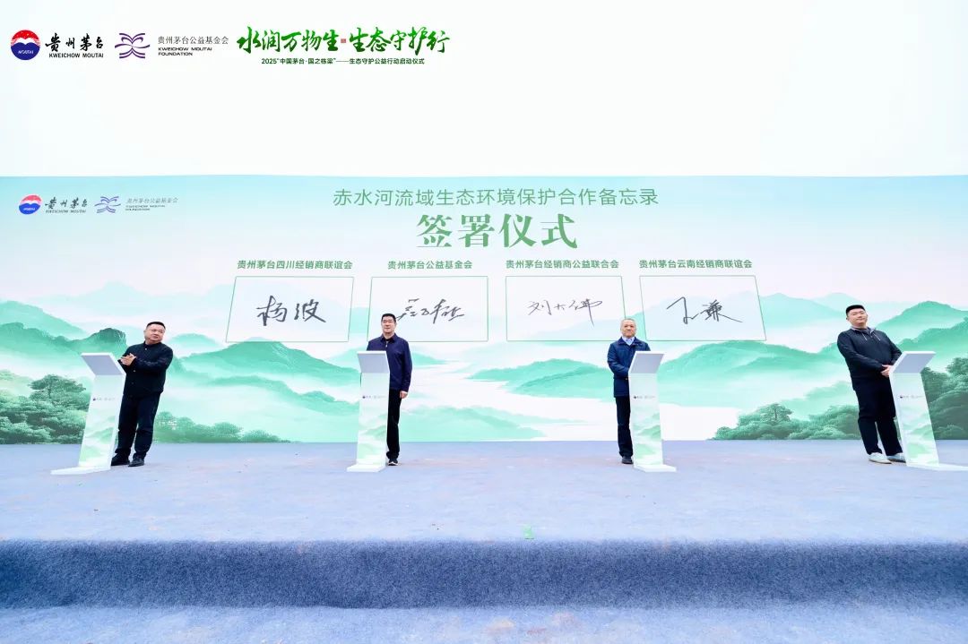 贵州茅台公益基金会理事长卓玛才让与云、贵、川三地茅台酒经销商联谊会会长签署赤水河流域生态环境保护合作备忘录