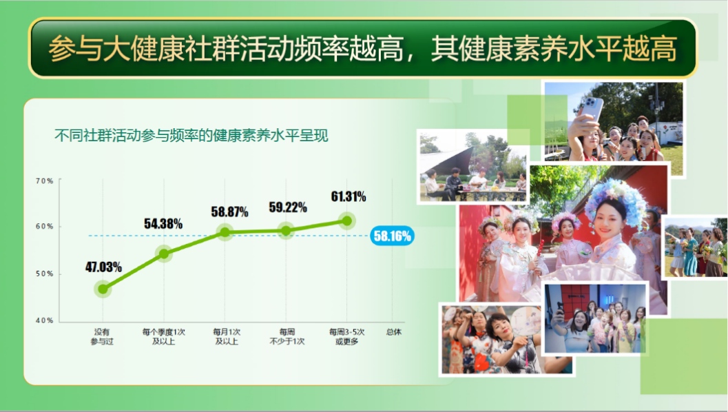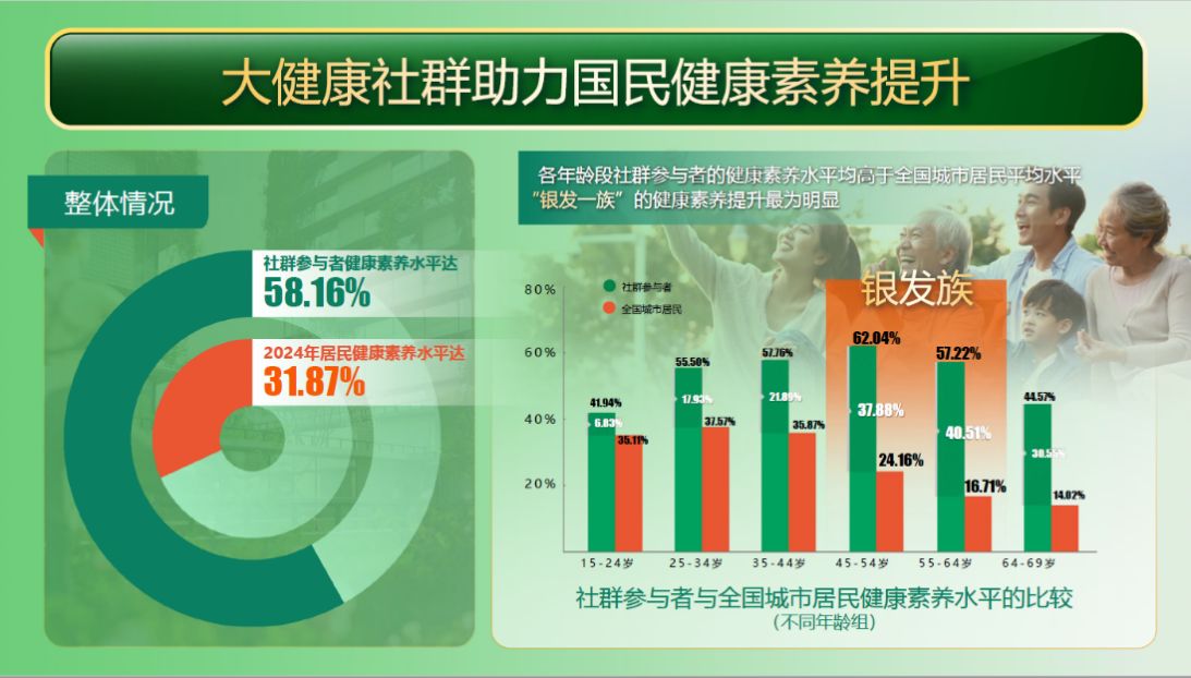 今年的调研显示,对比2024我国居民健康素养水平达到31.87%,社群参与者的健康素养水平为58.16%,充分印证大健康社群干预在促进公众健康素养提升、推动人口高质量发展方面的科学性、实用性和有效性。以下为今年调研工作的部分数据和结论呈现: