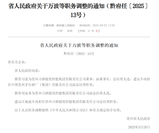 贵州省人民政府:推荐万波为习酒集团副董事长、总经理