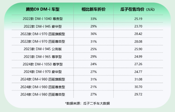 基于瓜子二手车大数据分析,腾势D9的插混版本,因其兼顾经济性与持续续航能力,在市场上更受欢迎,二手市场上的车源也以该插混车型为主,这里我们也主要推荐插混车型。