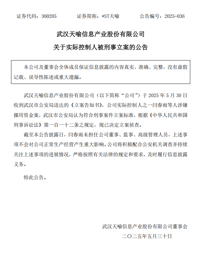 2025年5月30日,武汉天喻信息产业股份有限公司发布公告表示,“2025年5月30日收到武汉市公安局送达的《立案告知书》 ,公司实际控制人之一闫春雨等人涉嫌挪用资金案,武汉市公安局认为符合刑事案件立案标准, 根据《中华人民共和国刑事诉讼法》第一百一十二条之规定,现已决定立案侦查。截至本公告披露日,闫春雨未担任公司董事、 监事、高级管理人员,上述事项不会对公司正常生产经营产生重大影响。公司将积极配合公安机关调查并持续关注上述事项的进展情况, 严格按照有关法律的规定和要求,及时履行信息披露义务。特此公告。”