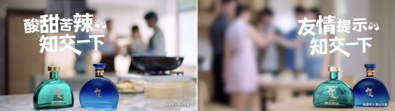 夜聊场景凸显知交酒在社交互动中的情感价值,成为友谊交流的纽带;调酒场景聚焦创意饮用方式,知交酒新中式调酒的巧妙搭配,为消费者提供个性化的饮用体验;