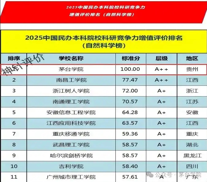 更值得关注的是,在神针评价(SZPJ)发布的“2025年中国民办本科院校科研竞争力排名”中,茅台学院科研竞争力增值评价(自然科学榜)跃居全国第一,科研实力(自然科学榜)位列第三,A++评级彰显硬核实力。